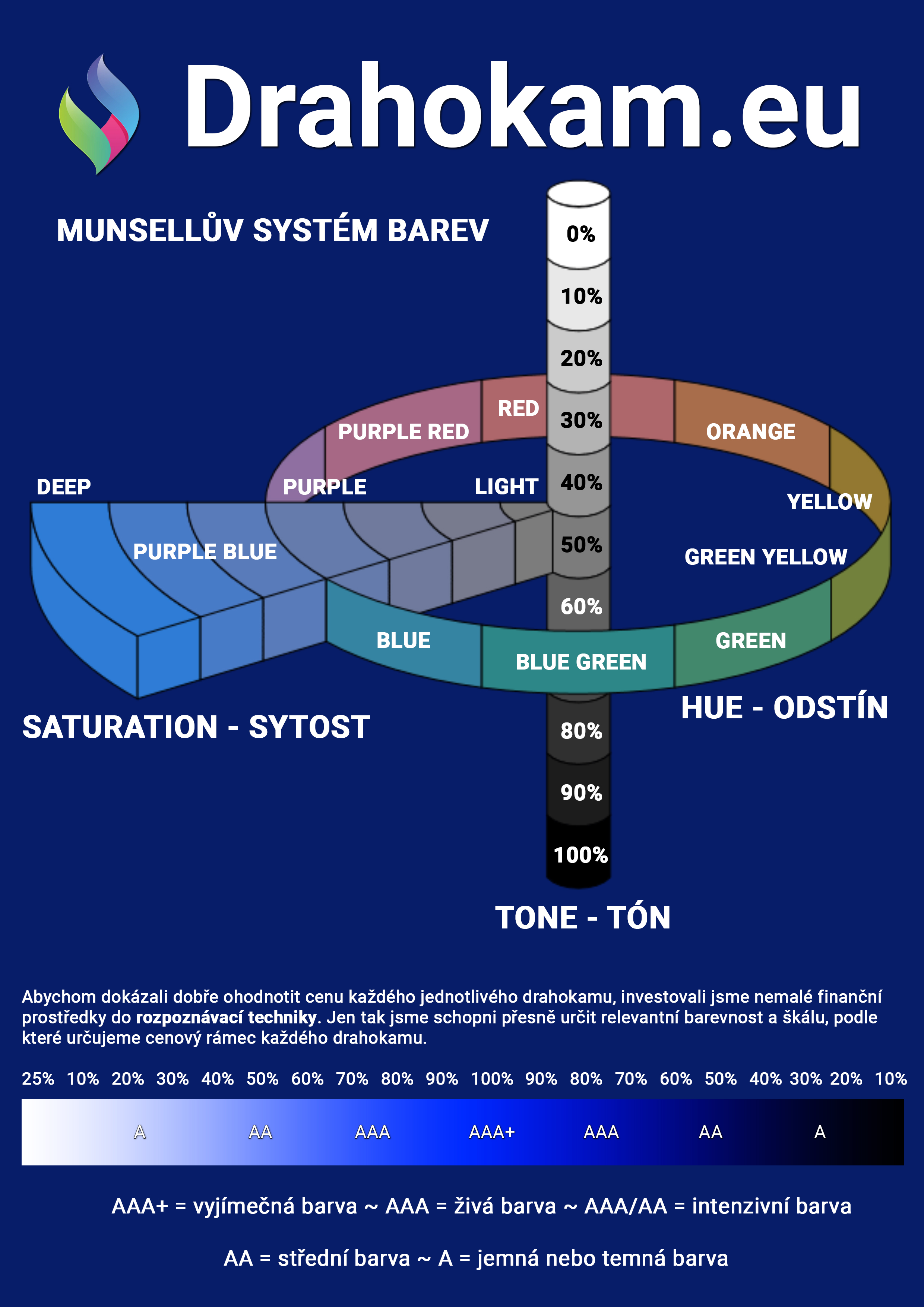nejen že udává cenový rámec kamene, ale i jeho likvidnost. Podléhá také módním trendům, a tak se často kameny v určité barvě stanou populárnější a jejich cena překotně roste.