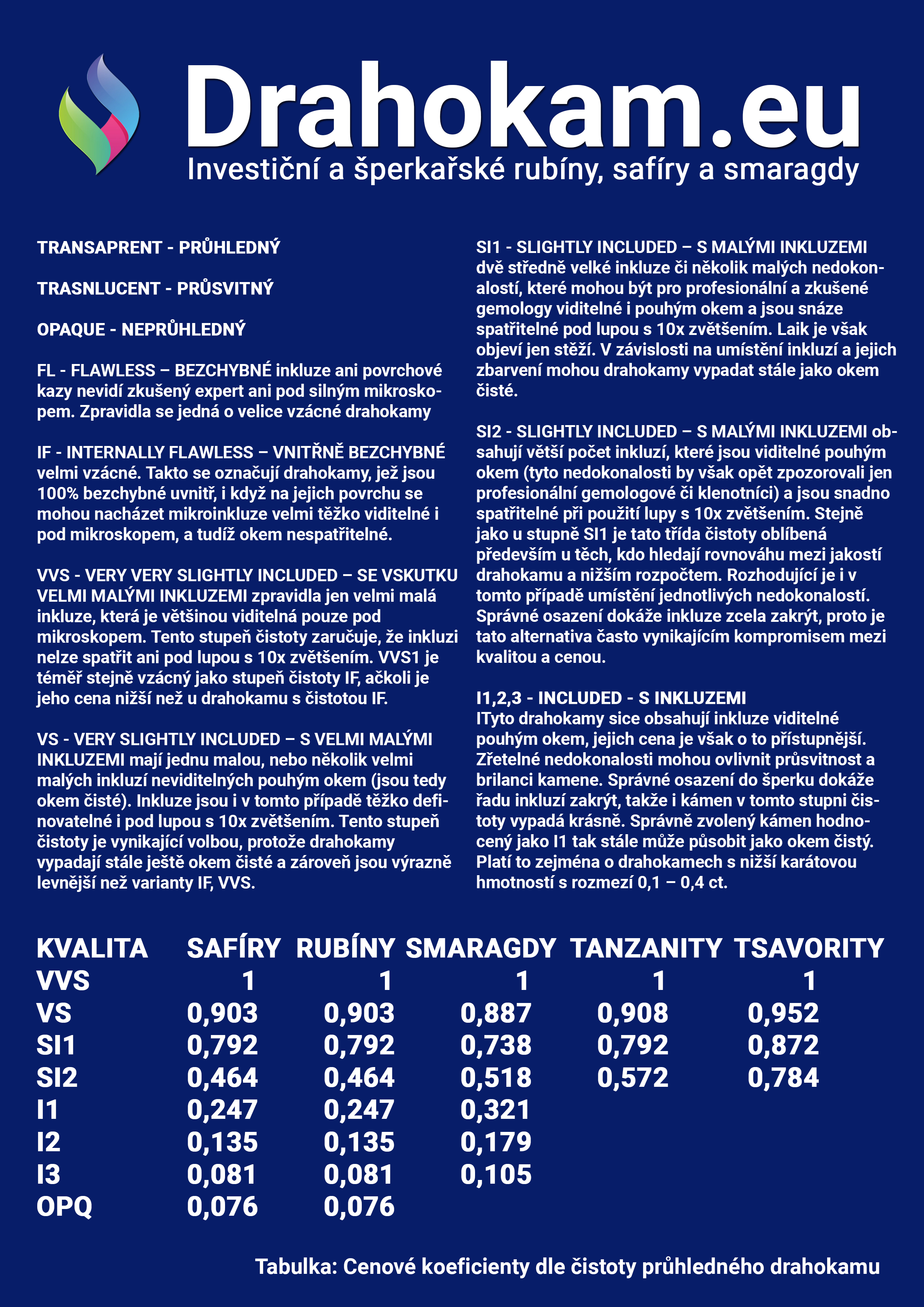 pokud je kámen průhledný, má mnohem vyšší cenu než průsvitný. Kameny v dokonalé kvalitě však atakují hranice stovek tisíc korun. Pokud máte nižší rozpočet, i tak můžete rozumně investovat.