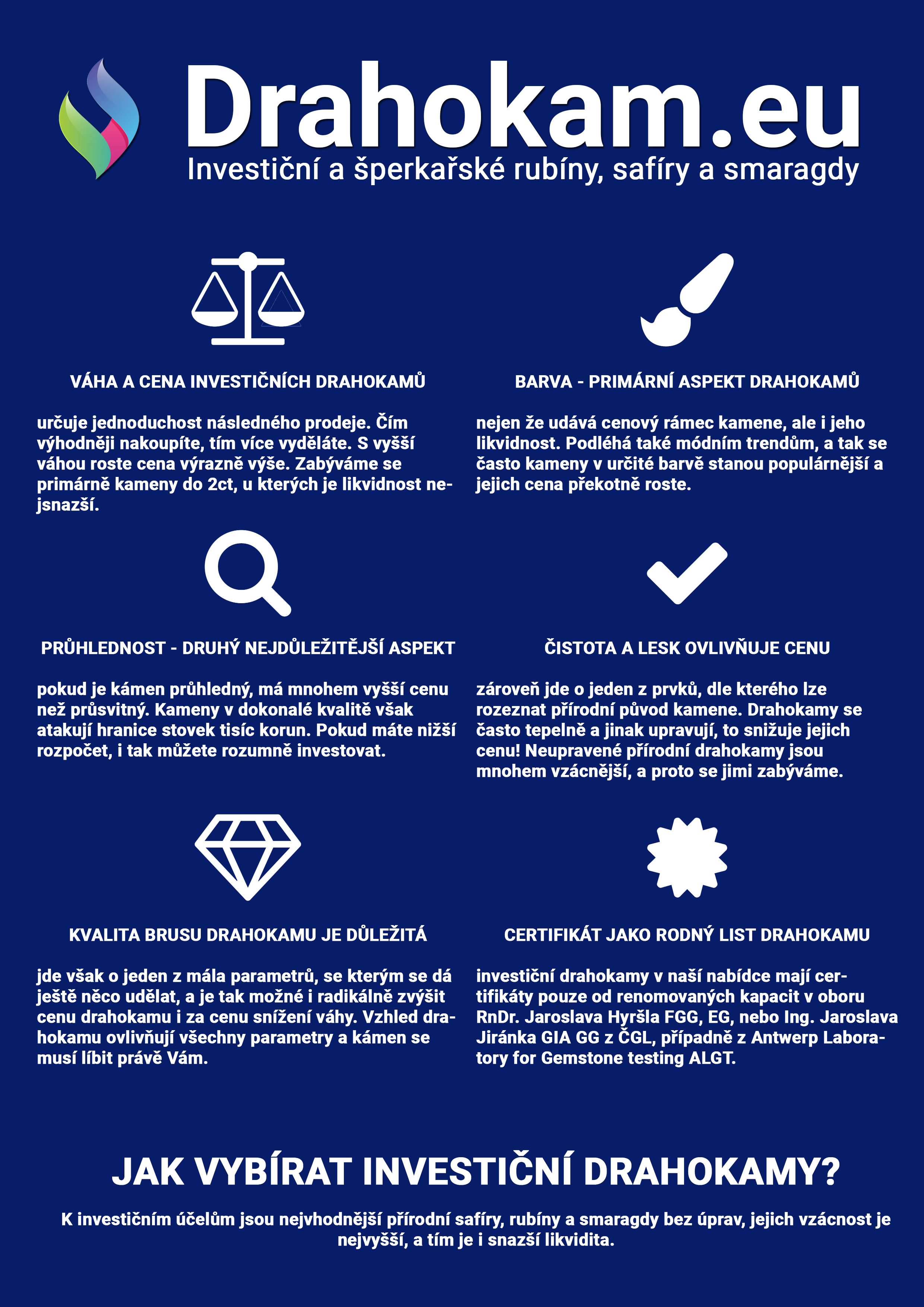 Kvalitní drahokam je přírodní, nijak neupravovaný teplem nebo glazováním. Takový kámen je pak snadné likvidnit a jeho cena v čase roste a minimálně si drží svou hodnotu (zvyšuje svou cenu dle inflace). Zároveň ubývá nalezišť, a tím pádem samozřejmě roste cena jednotlivých kamenů nad úroveň inflace. Řada odborníků čeká během svých životů nárust ceny kvalitních drahokamů o řád až dva, což ještě před deseti lety bylo neočekávatelné.