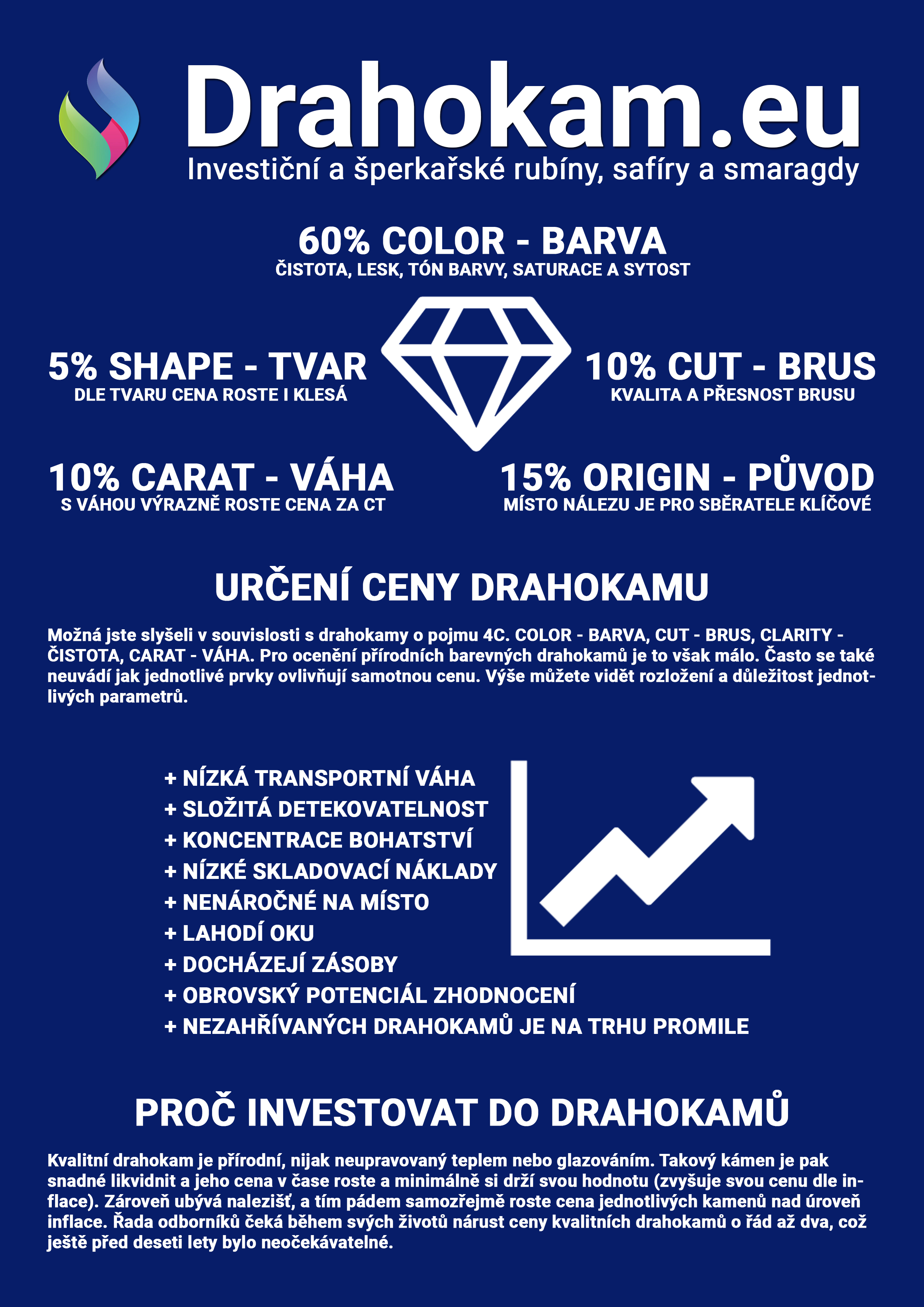 Drahokamy jsou dle našeho názoru z mnoha ohledů bezpečnější a likvidnější než například investice do zlata a drahých kovů. Safírům, rubínům a smaragdům dlouhodobě cena roste výrazně nad úroveň inflace. Cena zlata dlouhodobě roste jen s růstem inflace a někdy ani to ne.
